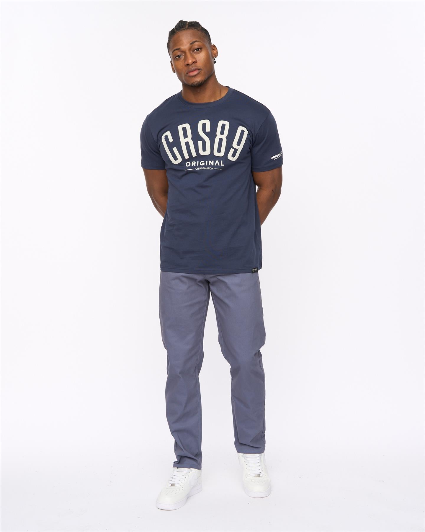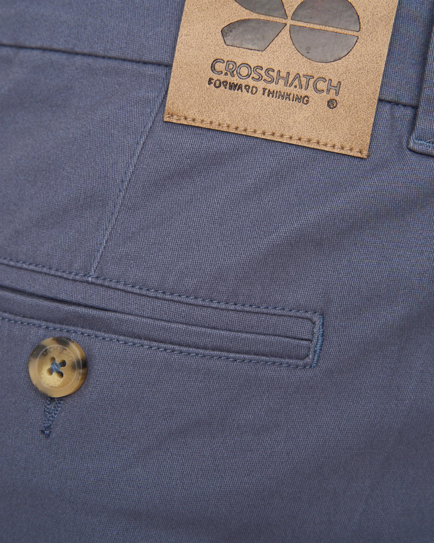 Men's core stretch slim fit chino with self fabric inner waistband facing, mock horn button fastening waistband, zip fastening fly, angled front side entry pocket mouth openings, jetted back pockets with button fastenings, darted back yoke, twin-needle stitched outer leg seams and matching colour thread topstitching throughout.